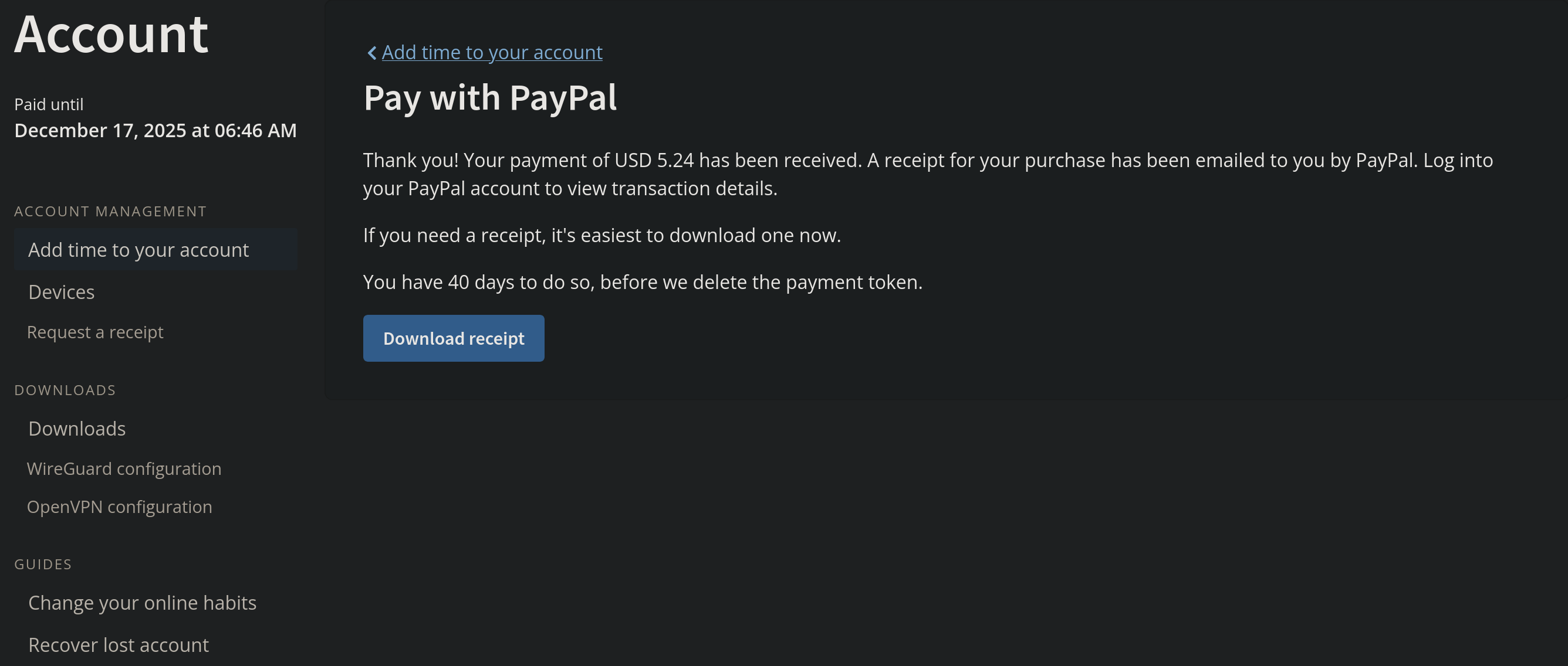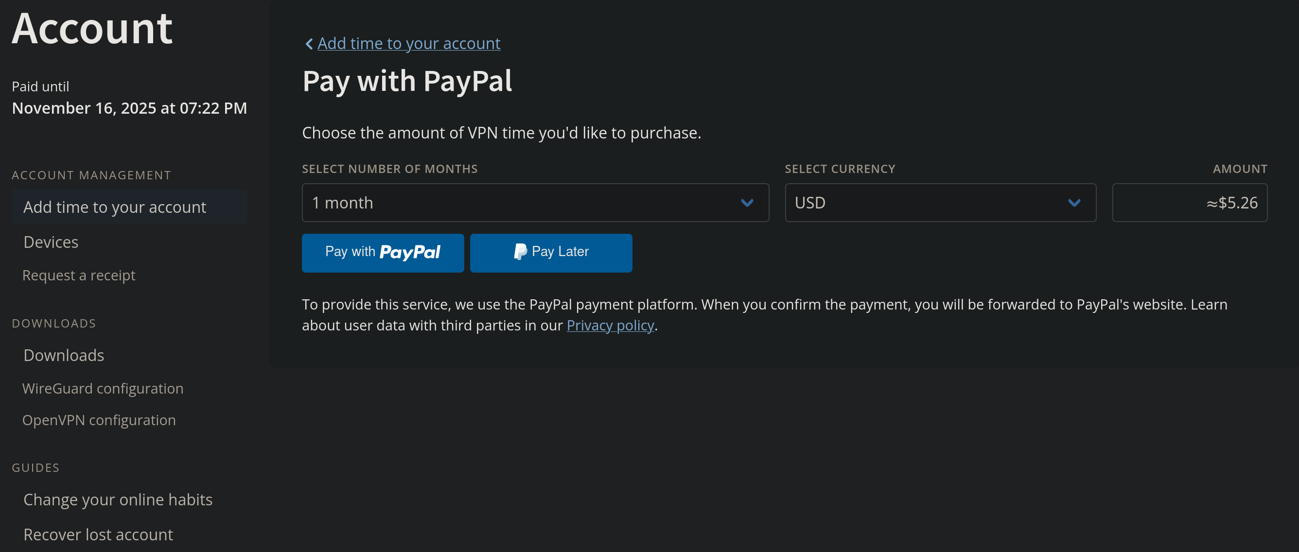 Follow these steps to add more time to your Mullvad account with a credit card or PayPal: